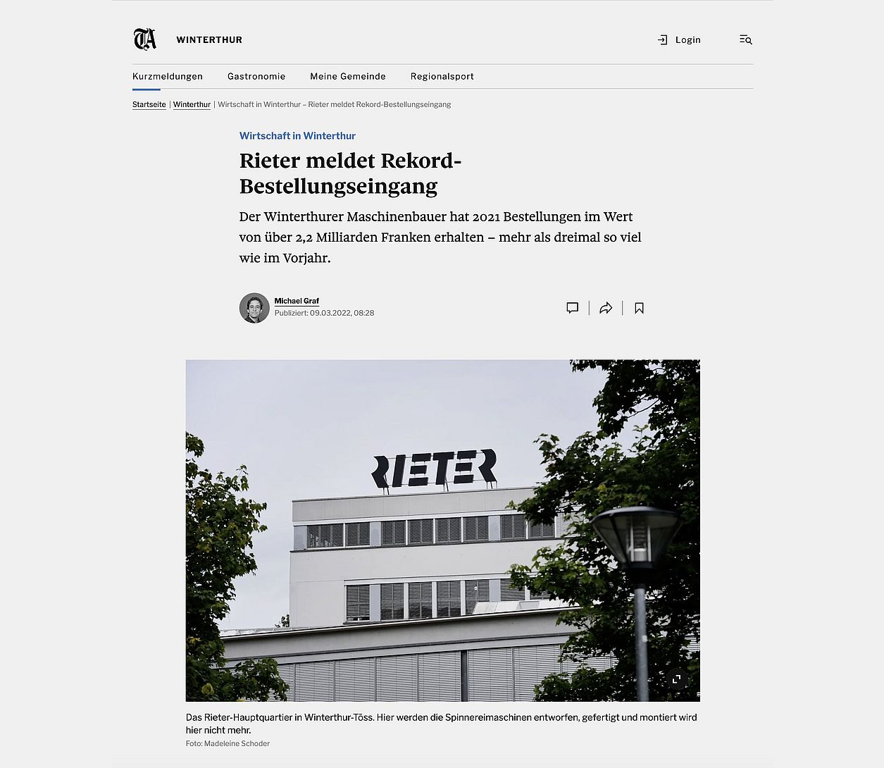 Rieter sells the large site at its headquarters in Winterthur, which is no longer necessary for operations, to the Swiss real estate group Allreal. With a total area of around 75 000 m2, it achieves a purchase price of CHF 96 million. The new Campus is not part of this transaction.