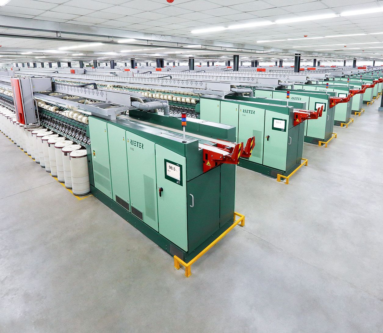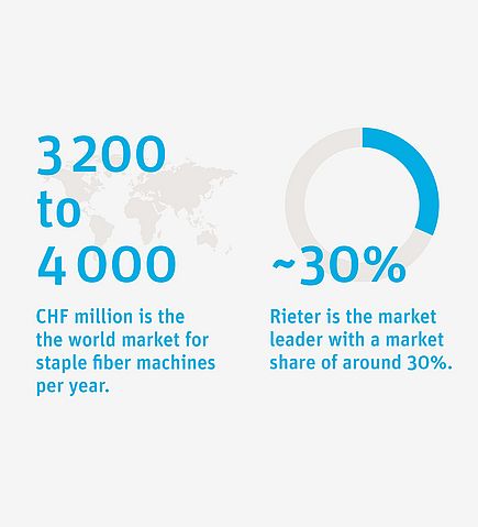 Rieter supplies around 1.83 million spindle equivalents. This value is used to measure the capacity for yarn production. More than 250 million are in use worldwide. The relevant market for Rieter has an annual volume of between CHF 2.3 billion and CHF 4 billion. Rieter is the market leader with a share of around 30%.