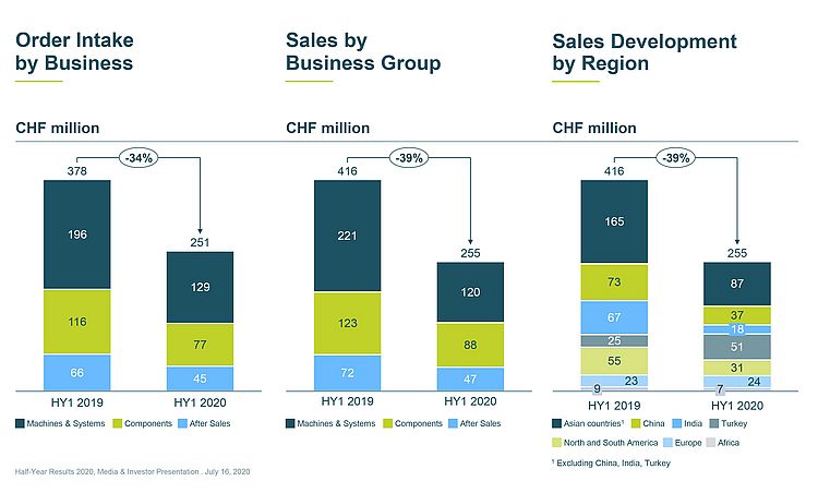 After the outbreak of the pandemic, many spinning mills around the world come to a standstill in the second and third quarters. Customers stop planned investments and ask Rieter to postpone deliveries. Order intake for the fiscal year plummets by 31%, sales by 25% and Rieter suffers a severe loss.