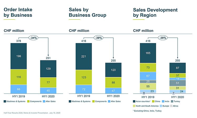 Der Handelskonflikt zwischen den USA und China, Überkapazitäten sowie politische und ökonomische Unsicherheiten mindern die Umsatzentwicklung in allen Regionen, vor allem auch in Schlüsselmärkten: in Indien um 32%, in der Türkei um 57%. Auf erfreuliches Echo stossen dafür die Innovationen von Rieter.